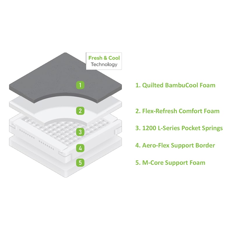 The 2cm deep Quilted BambuCool Memory Foam top layer regulates body temperature throughout the night whilst contouring to your body’s shape. By evenly distributing your body weight, it relieves pressure points, reducing the risk of discomfort and promoting better sleep quality. Crafted from a unique cooling material, the Quilted BambuCool Memory Foam ensures a cool and comfortable sleep environment.